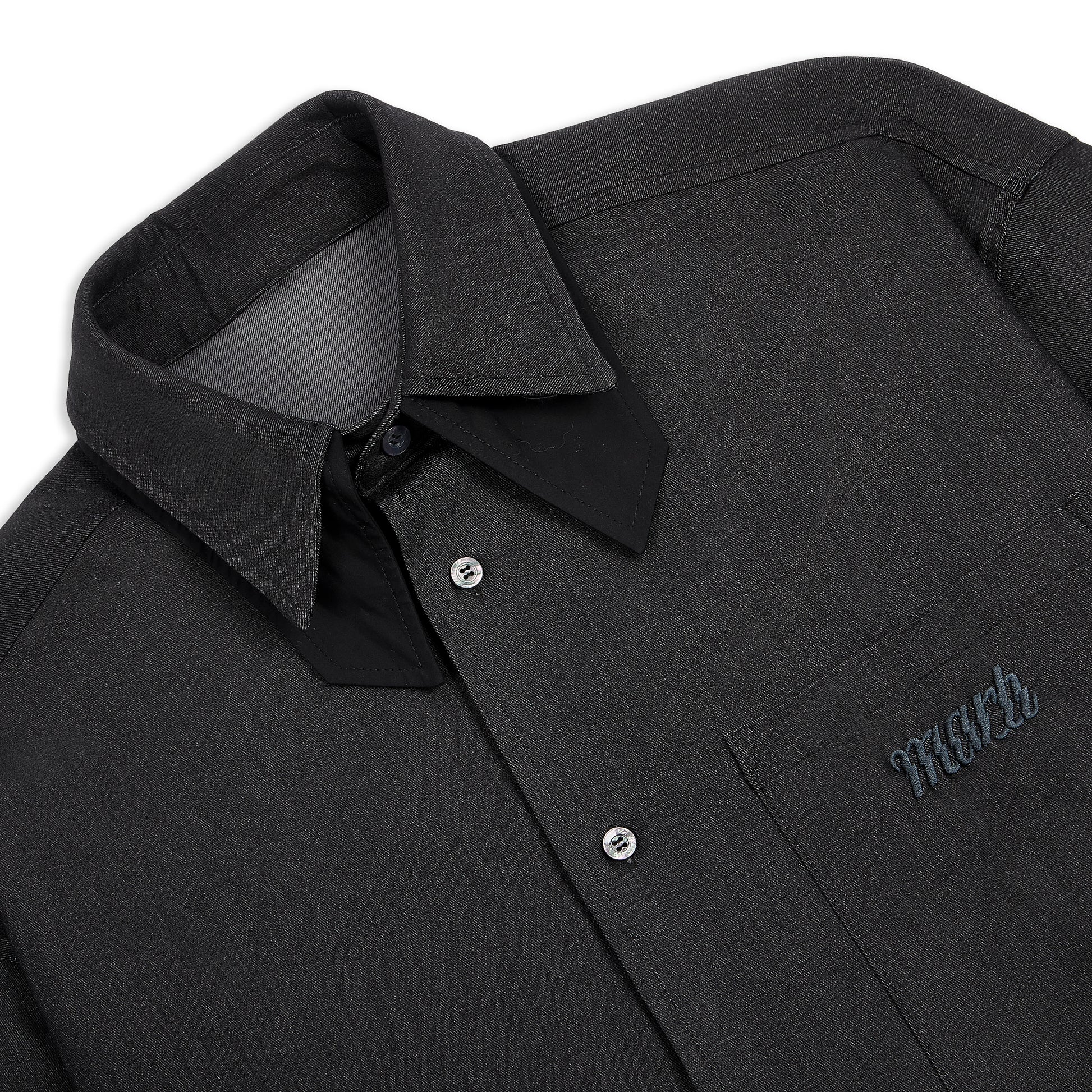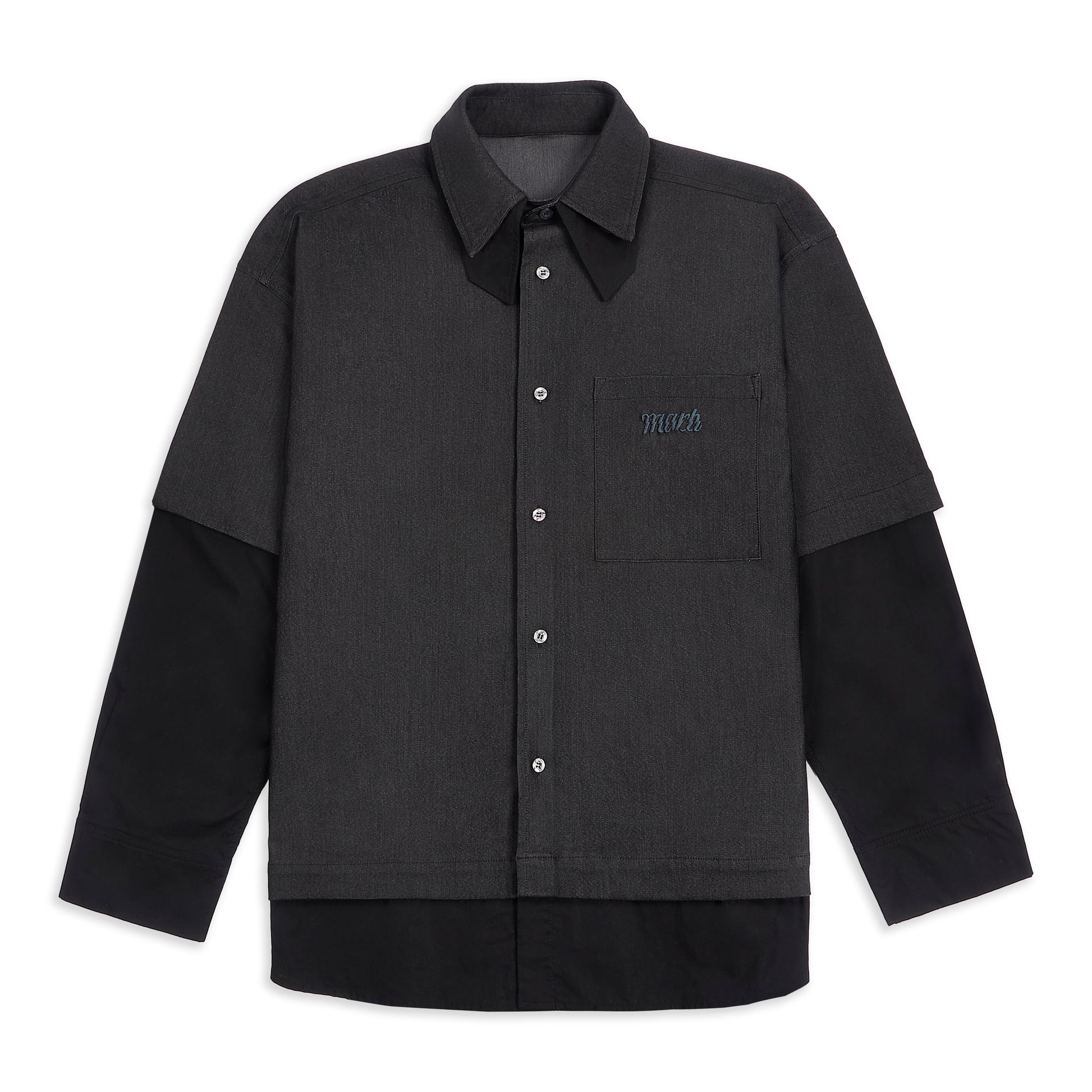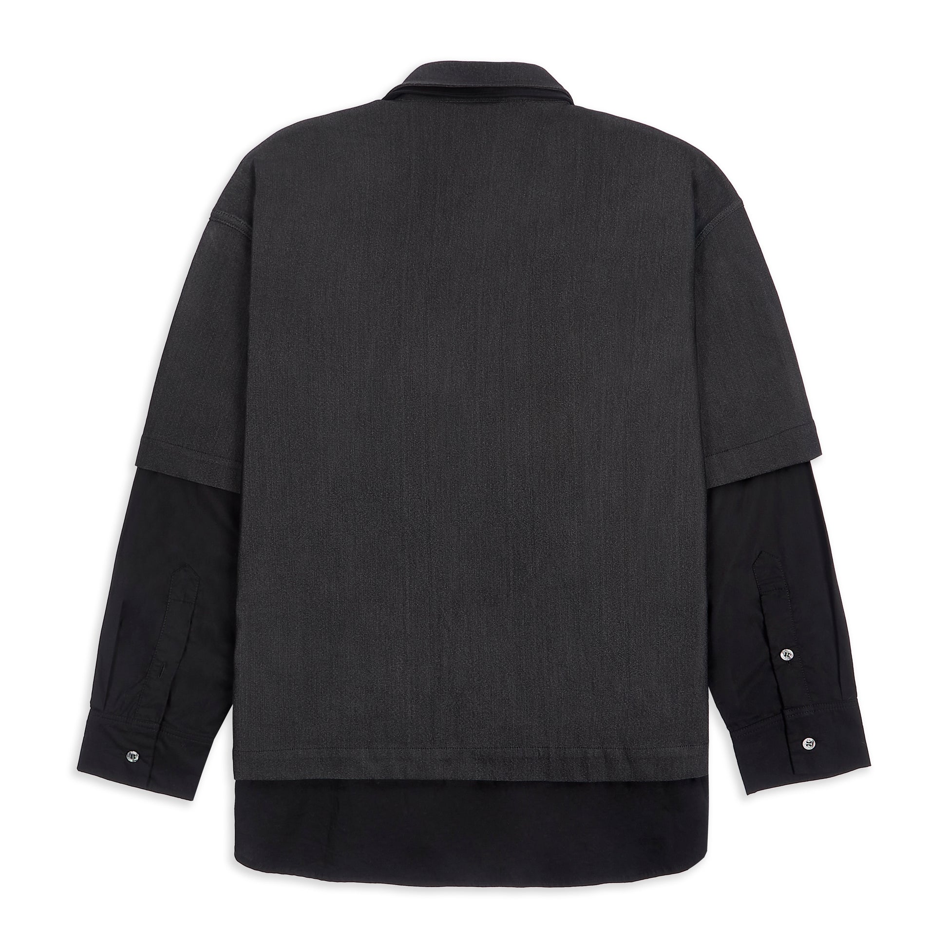 The Duality Overshirt blends a textured charcoal outer with a smooth black under-layer, creating a refined two-tone profile that sits between tailoring and everyday wear.