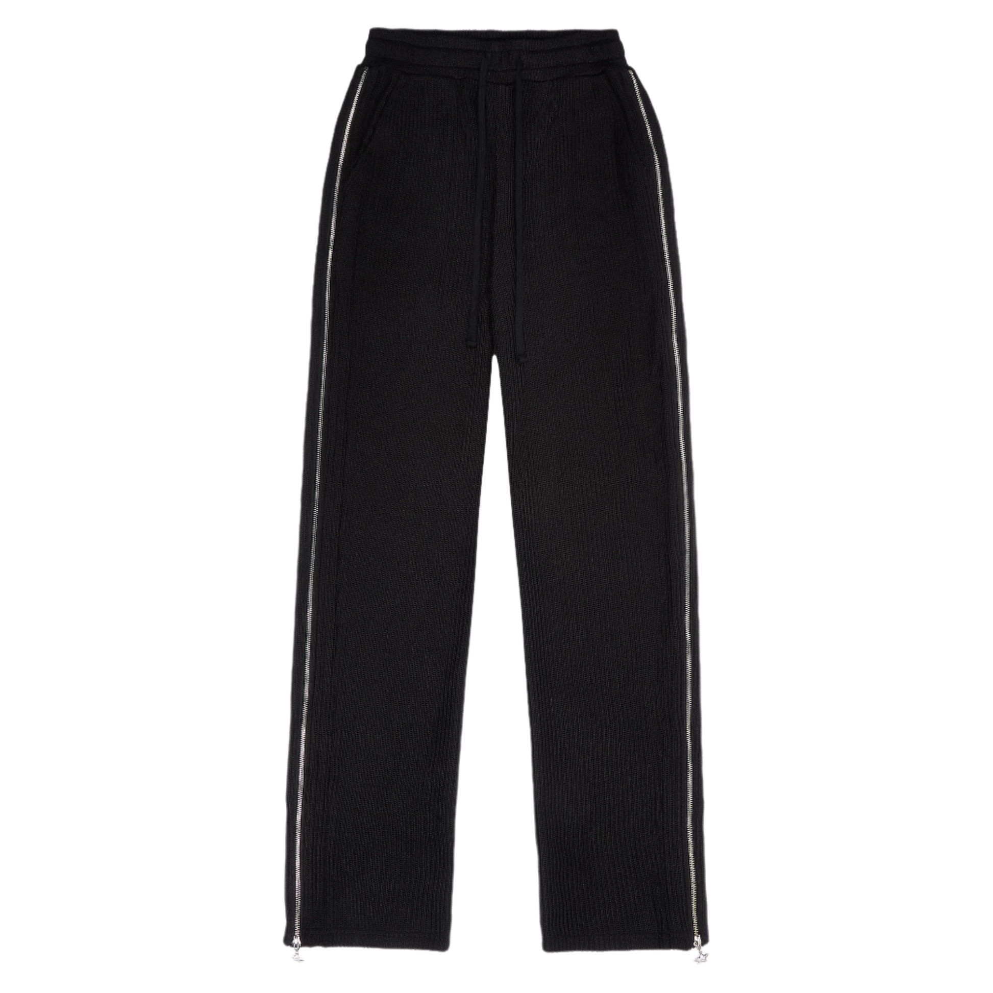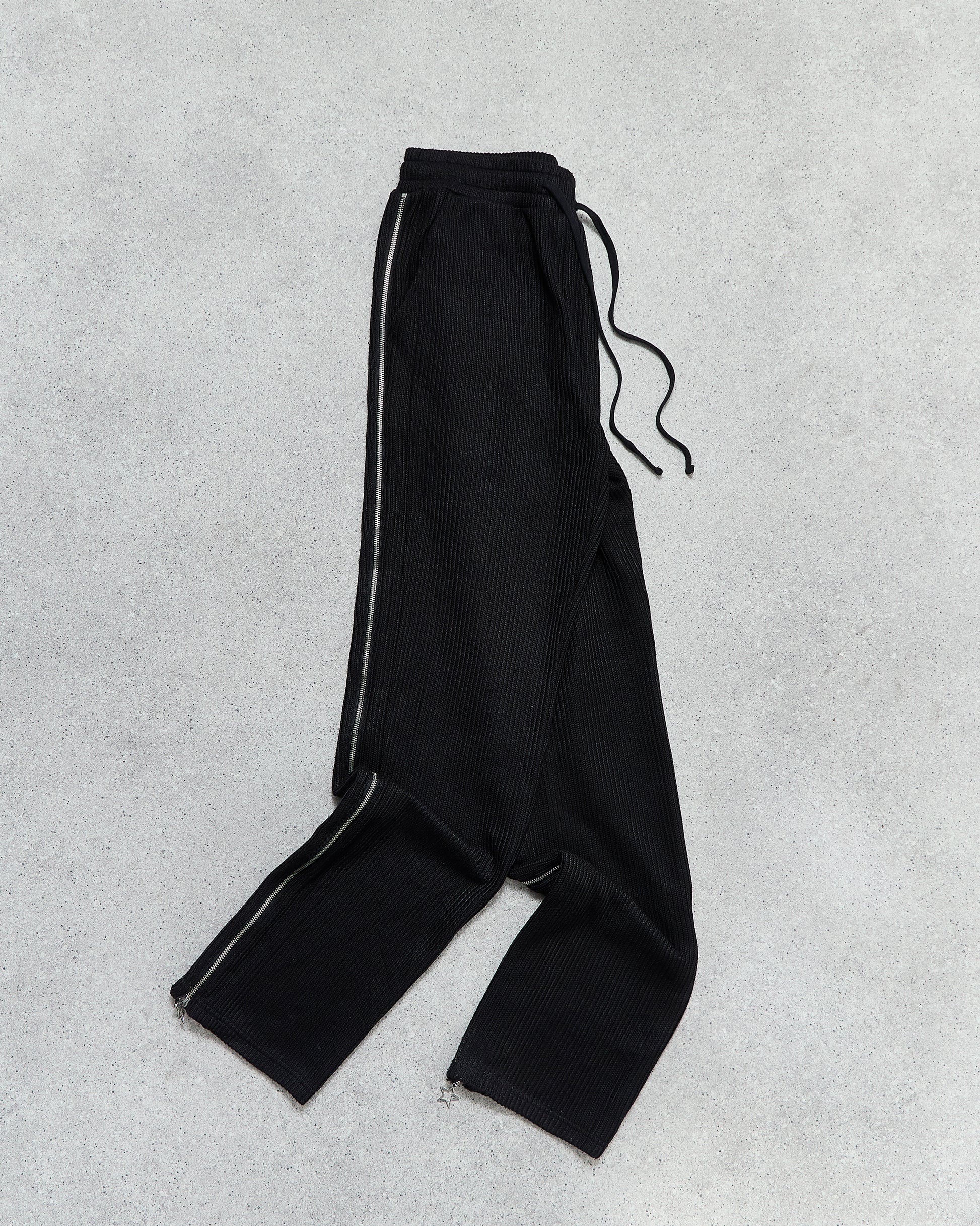 Black (Phantom) Knitted pants crafted for adaptability and ease. A full-length side zip allows the fit to expand from tapered to wide, finished with a custom star-shaped zipper pull that adds a subtle statement. Designed to stand alone but pairs effortlessly with the coordinating hoodie.